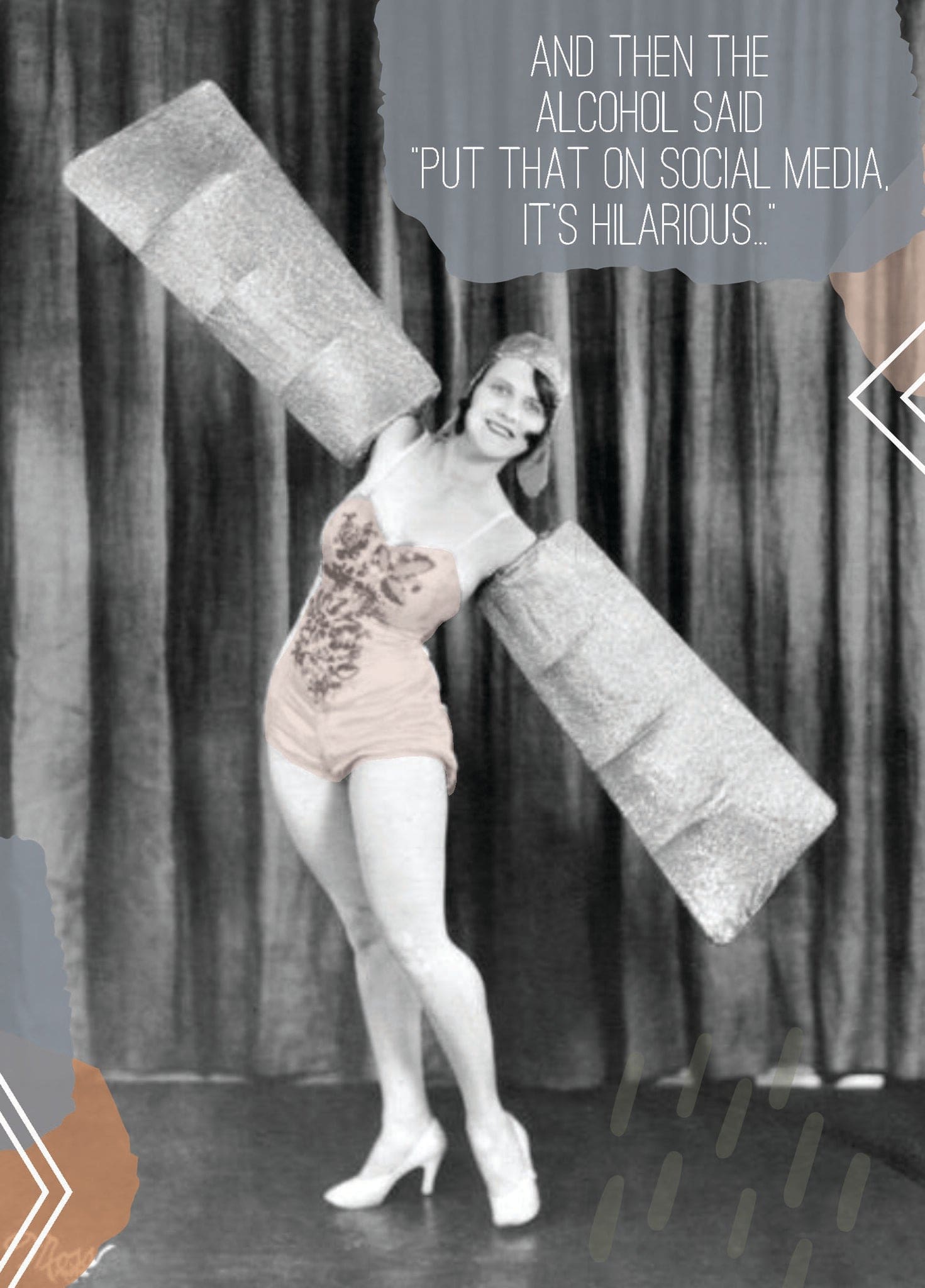 Front: And then the alcohol said "put that on social media, it's hilarious..."