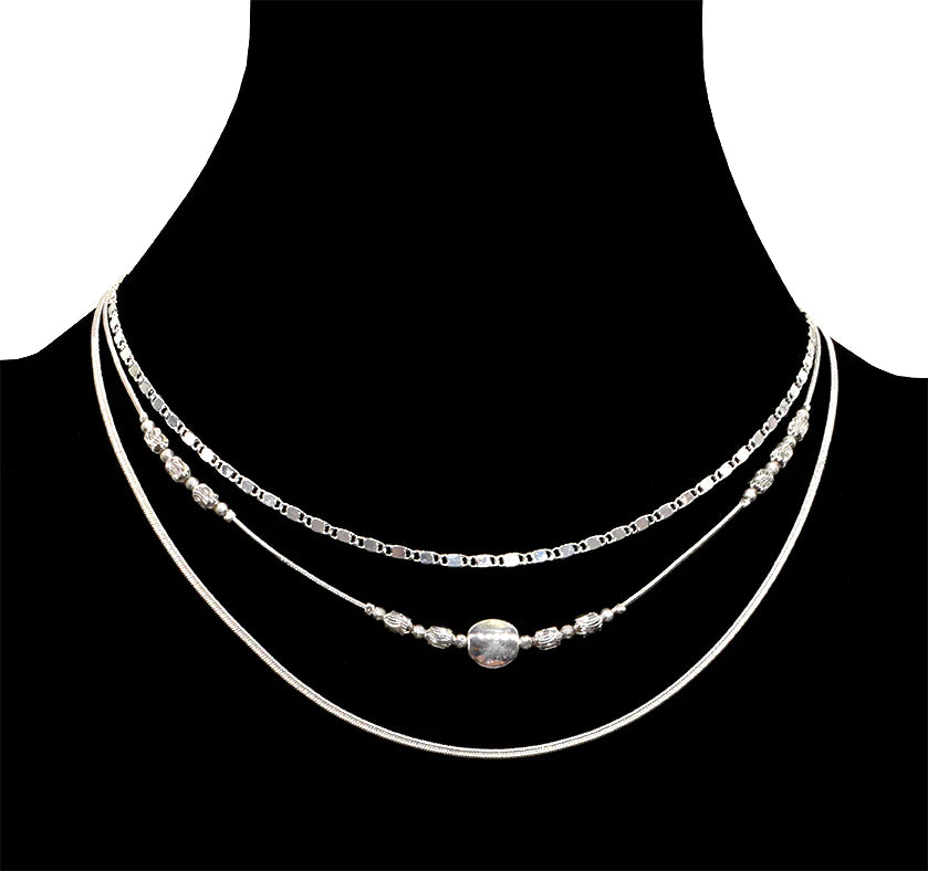 This Beaded Three-Strand Silver Necklace features a 15.5" length with a 2" extension for a customizable fit. Its layered design adds subtle shine, perfect for enhancing any outfit with elegance.
