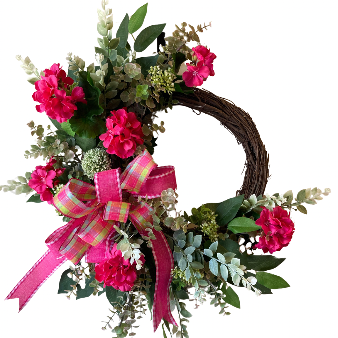 Elevate your home decor with our exclusive Hot Pink and Green Wreath. Adorned with vibrant pink geranium faux florals and a delicate pink and green ribbon, this wreath adds a touch of elegance and sophistication to any space. **Store pickup only**