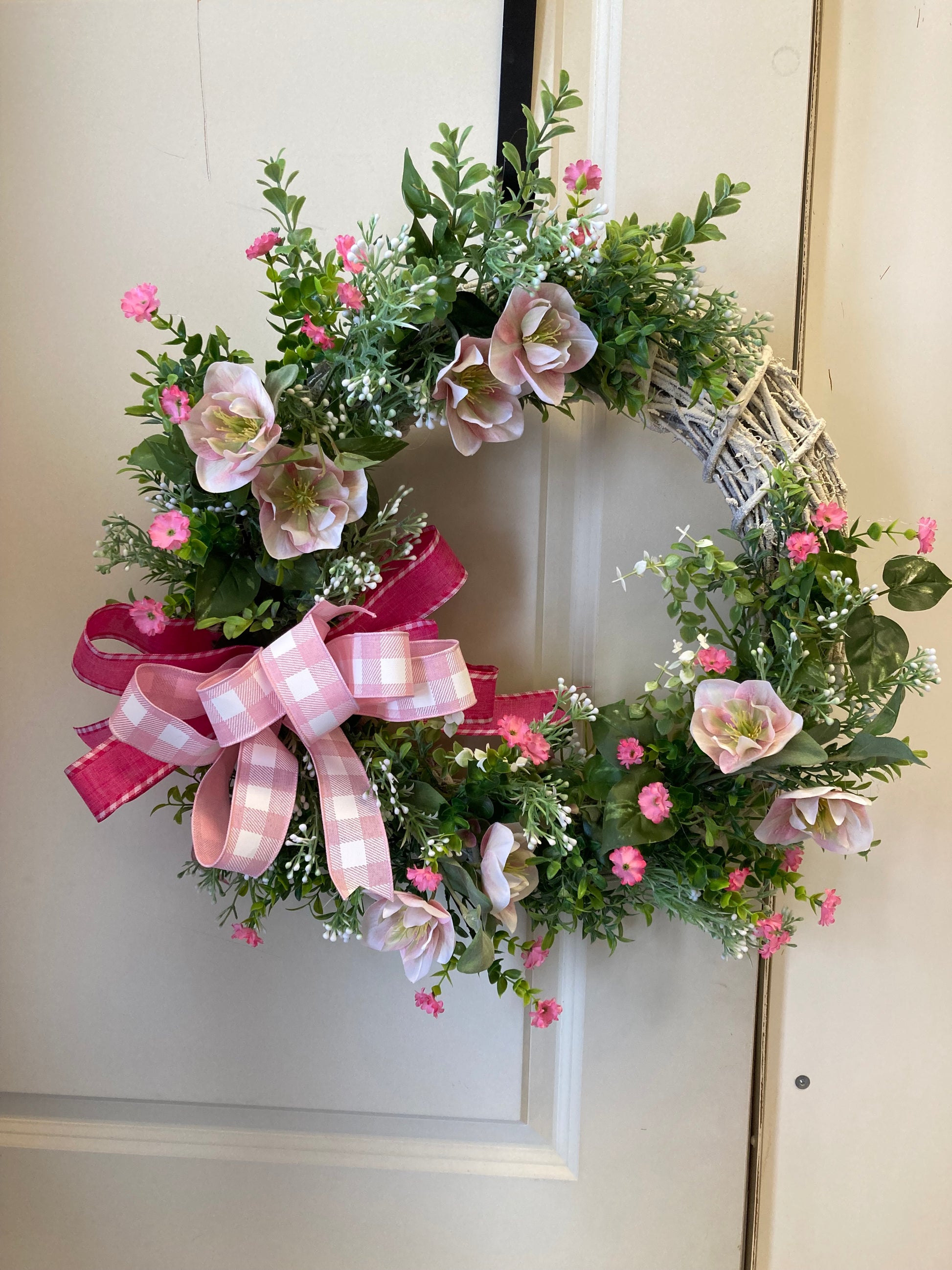 Bring a touch of natural beauty and feminine charm to your home with our Blush Bliss Wreath. Featuring lifelike artificial greenery and delicate pink and blush flowers, along with a creamy grapevine base and lovely Pink and White gingham ribbon, this wreath adds a touch of elegance to any room. In-store pickup available.