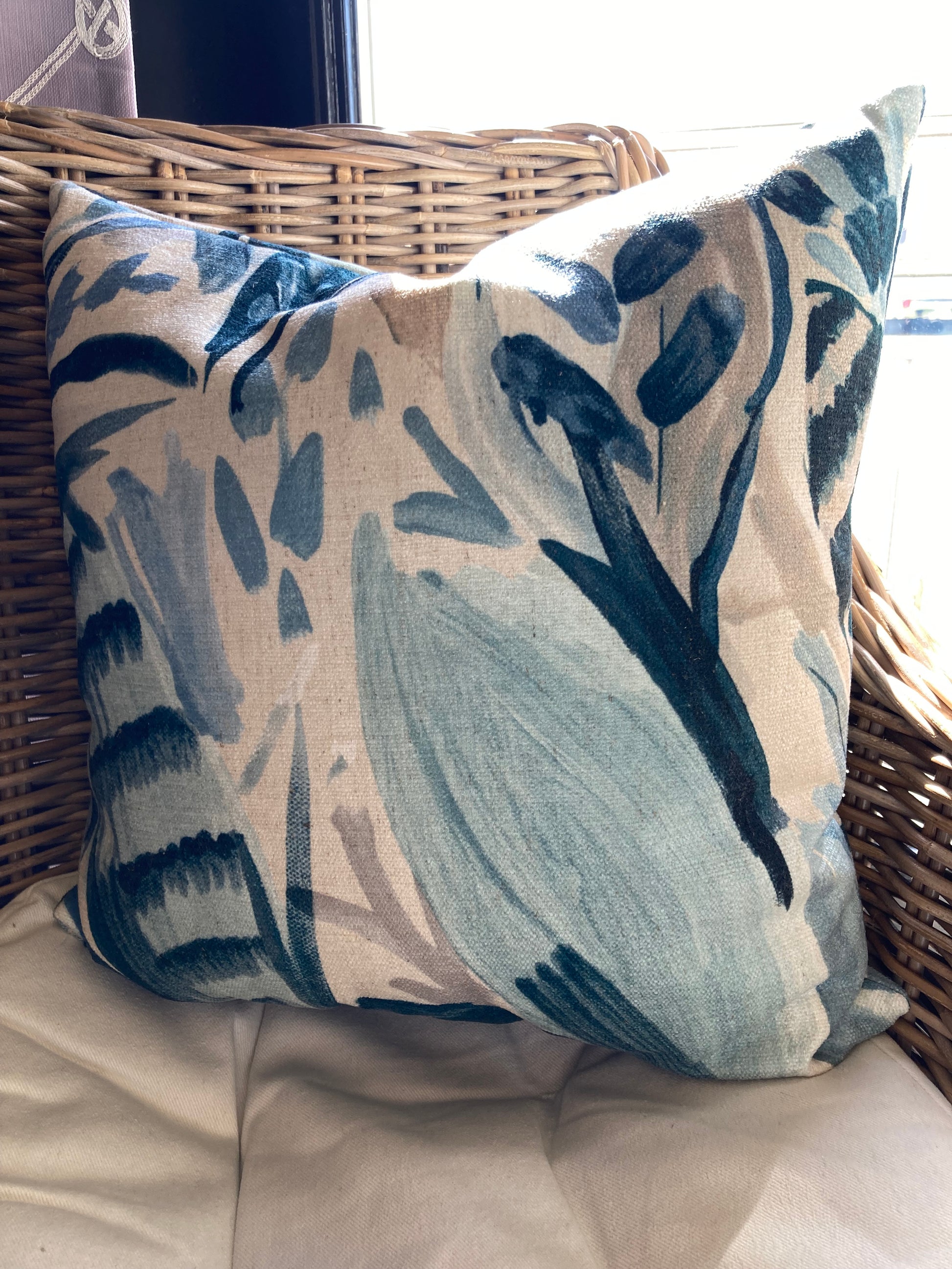 Elevate your home decor with our Canadian-made Frono Midnight cushion! Measuring 20 inches,. This eye-catching abstract teal leaf cushion adds a touch of elegance and comfort to any room. Includes faux down filler.