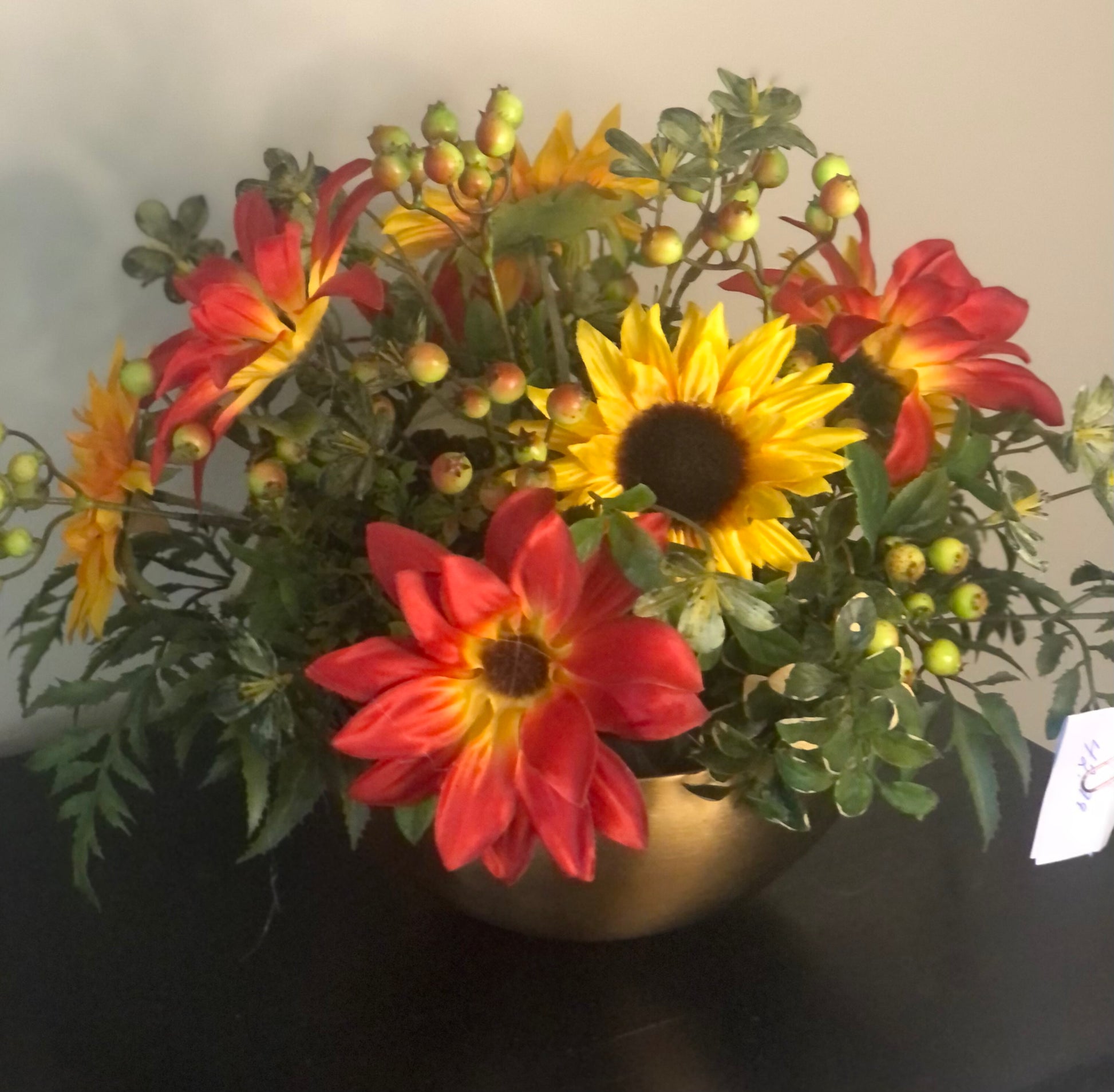 This stunning fall floral arrangement, measuring approximately 16" wide by 12" high, is beautifully crafted with lifelike artificial blooms in a chic gold bowl. Each piece is one-of-a-kind, making it a unique centerpiece that brings warmth and elegance to your space. Perfect for adding seasonal charm without the upkeep, this arrangement is available for pick up only. Elevate your décor effortlessly with this exclusive, timeless accent.