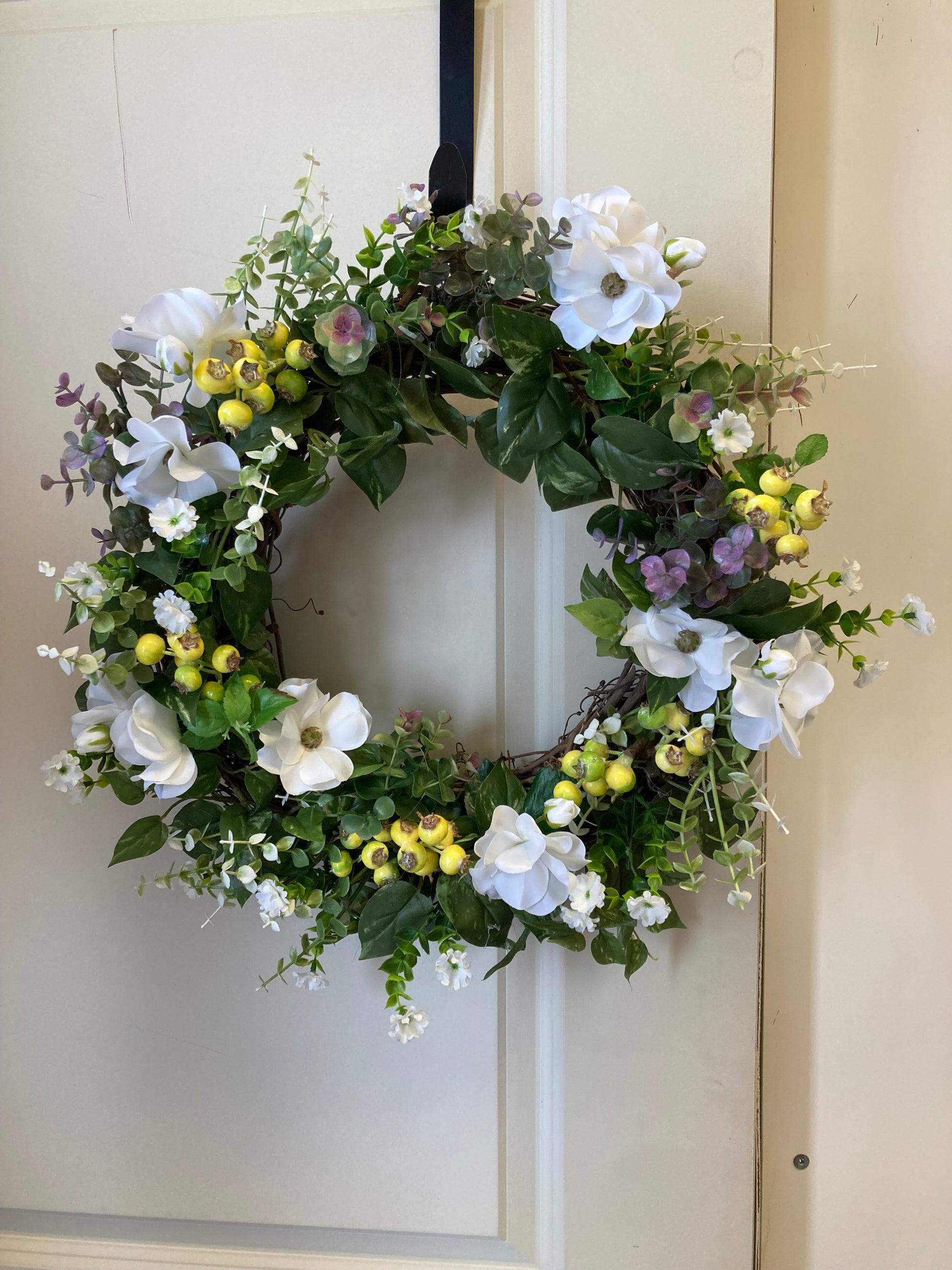 Bring the freshness and beauty of spring into your home with our Fresh Spring Wreath! Made with artificial white flowers, greenery, a hint of purple and yellow/green berries, this wreath will add a touch of nature to any space. Approximately 21 inches in size, it will add a burst of springtime joy to your decor. *In-Store Pickup available.