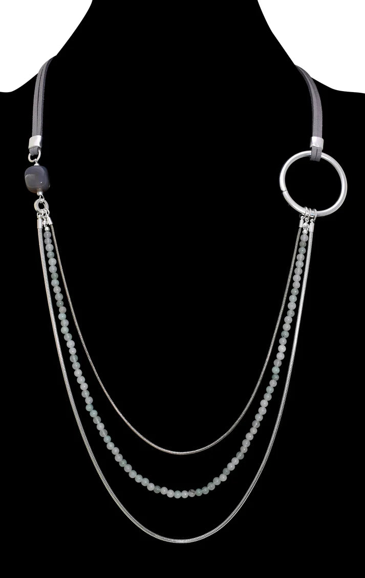 Elevate your style with our Grey Beaded with Circle Necklace. Crafted with dark grey leather, this necklace features a 24" length with a 3" extender for the perfect fit. Make a statement and add a touch of sophistication to any outfit. Don't just wear jewelry, make a statement with our beautifully crafted necklace!
