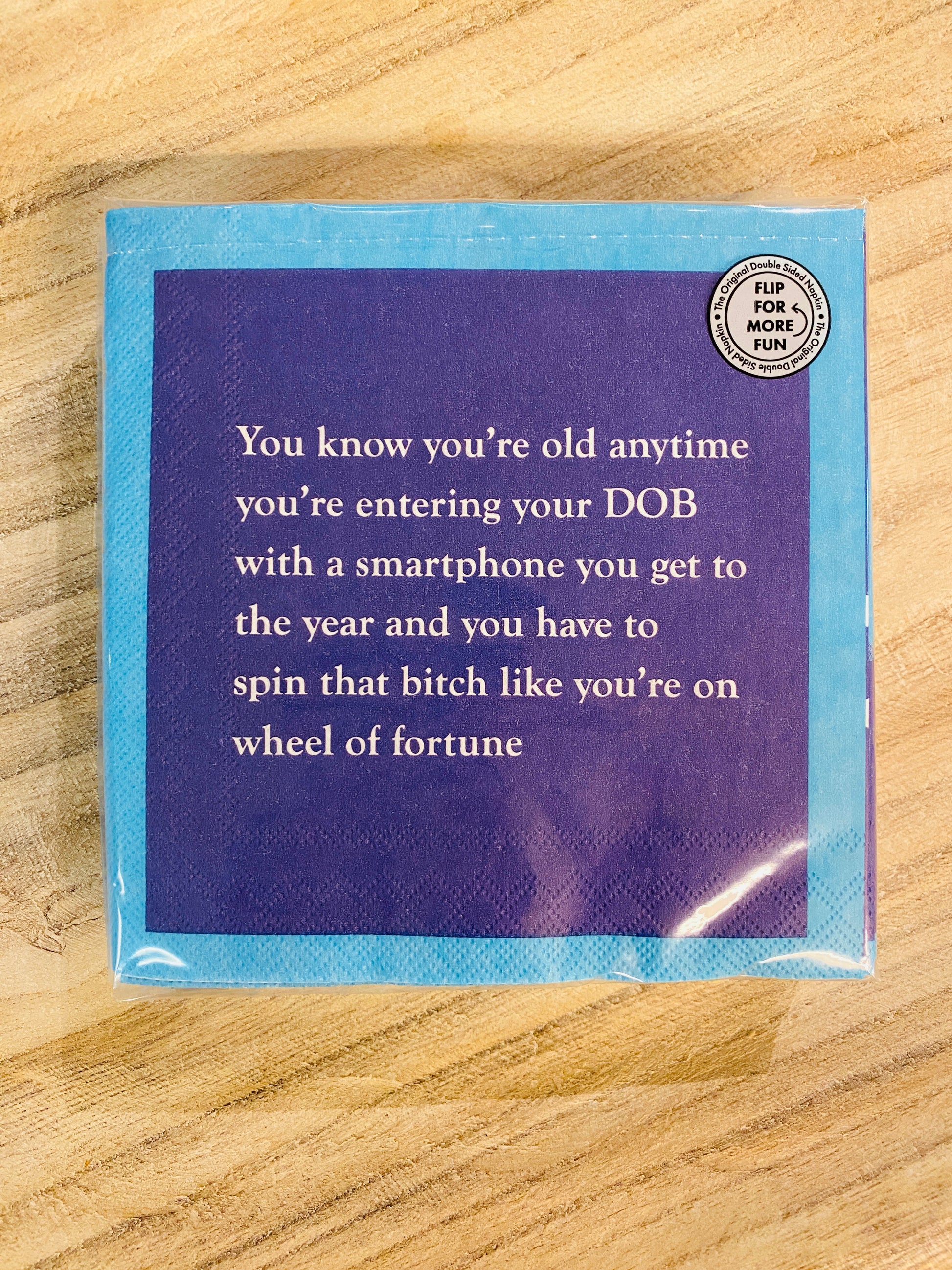 Enjoy happy hour with these double-sided cocktail napkins. One side's saucy humor will make you "spill" with laughter, while the other side will be there to save the spills. With two unique sayings for each napkin set, your guests will be entertained and you'll be the talk of the town!