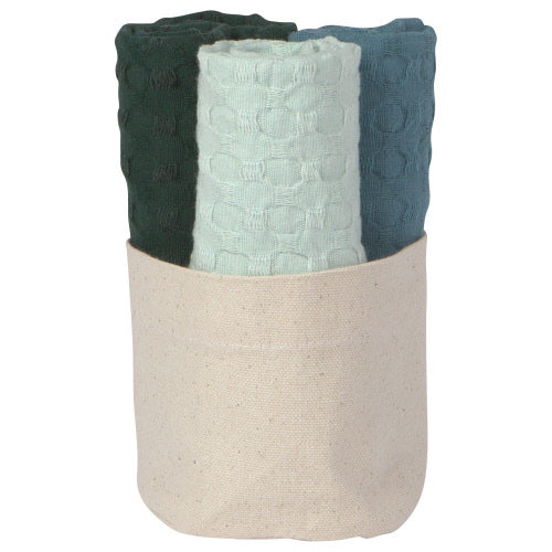 Introducing the Mercantile Set of 3 Dishcloths - Pine! This set includes three GRS-certified recycled cotton dishcloths, all nestled in a charming basket. Not only is it environmentally friendly, but it also makes for a thoughtful hostess or housewarming gift. Upgrade your dishwashing experience with these stylish and conscious dishcloths..