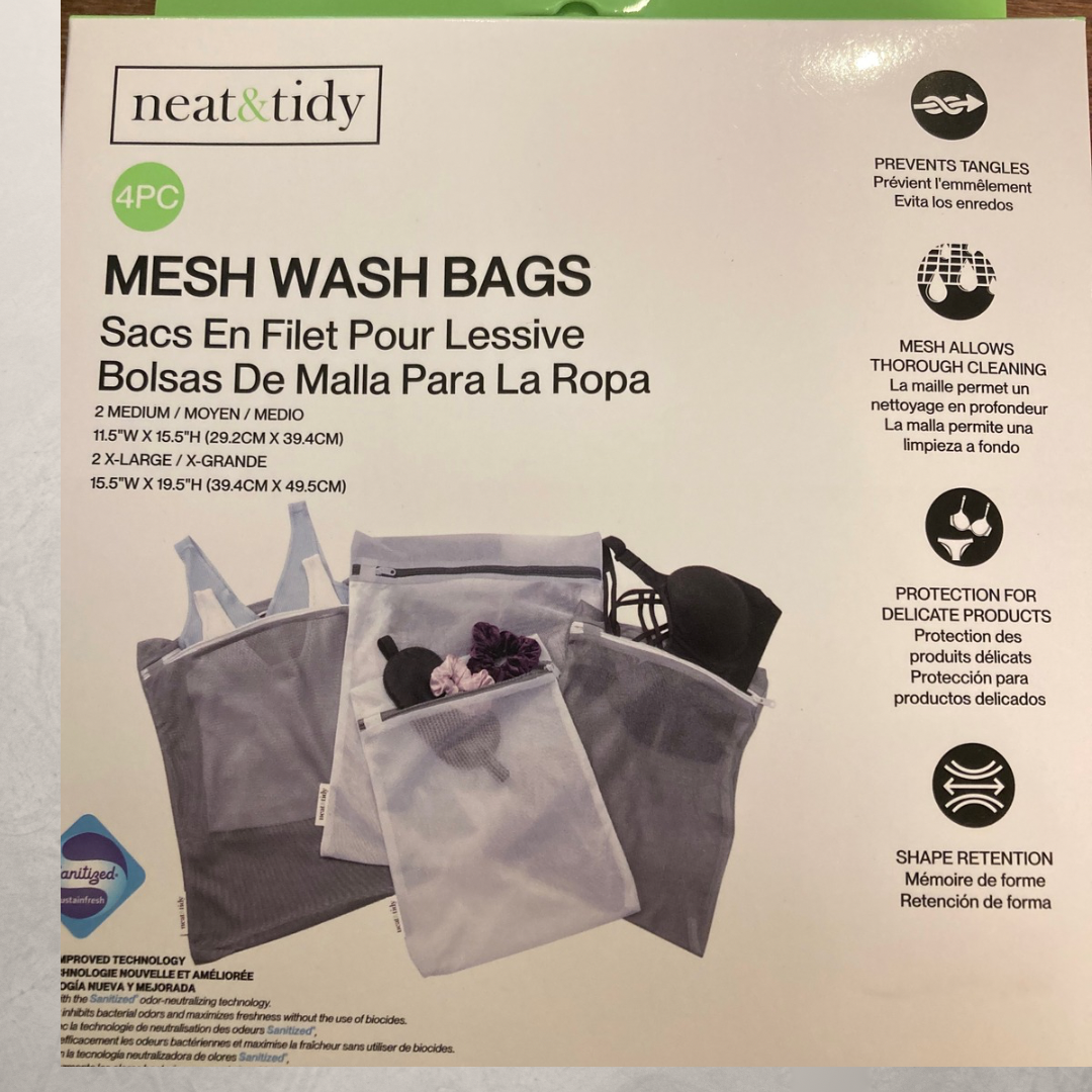 Keep your delicates safe and clean with our Neat & Tidy Mesh Wash Bag Set. The 4pc set includes 2 medium and 2 xlarge bags, perfect for various laundry needs. The mesh design allows for thorough cleaning while preventing tangles and maintaining shape. Protect your delicate products and simplify your laundry routine with this must-have set!