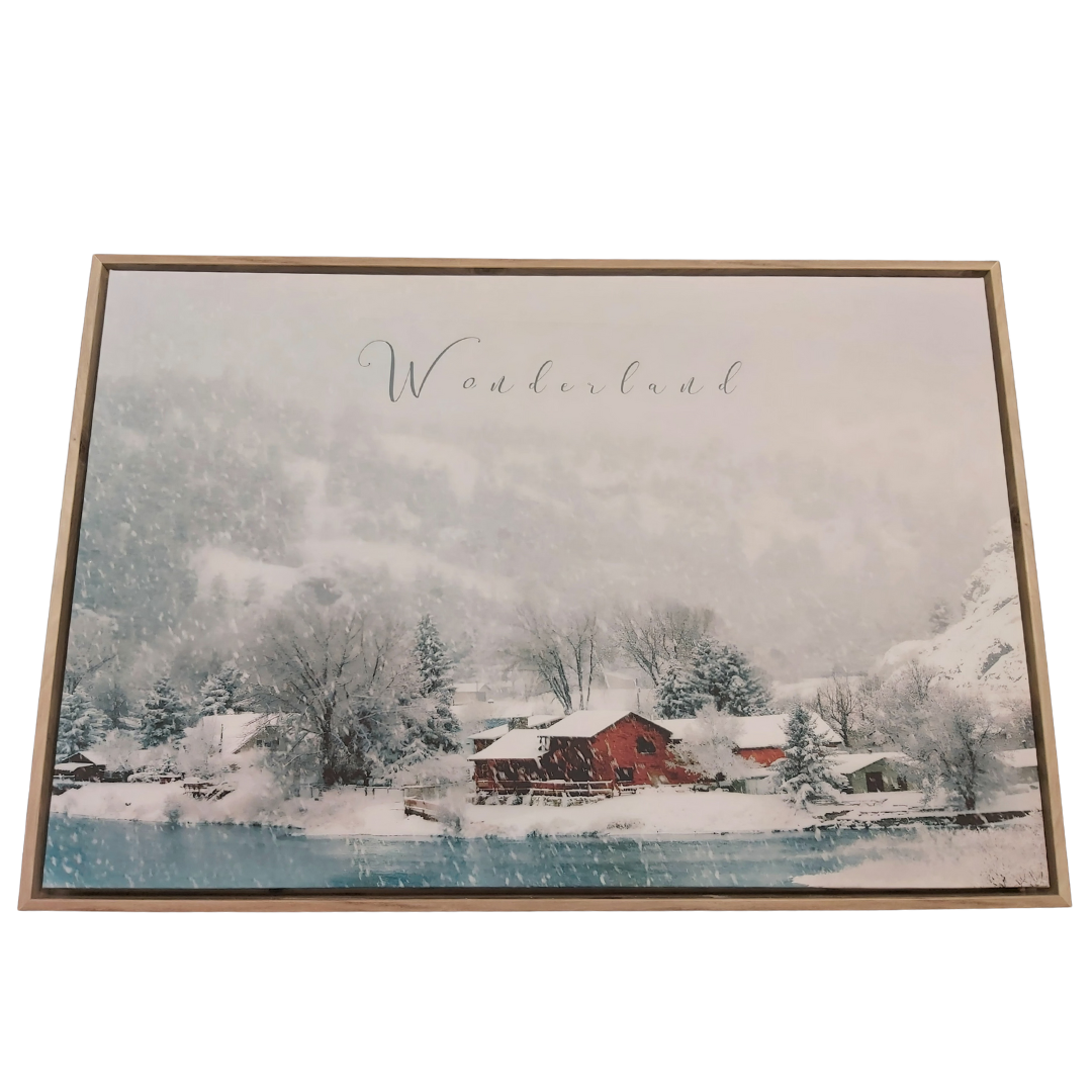 Enhance your space with the 24" x 36" Scenic Wonderland print, featuring a snow-covered red barn, frozen pond, and softly falling snow framed in light wood. A peaceful winter scene with a faint mountain backdrop, perfect for a cozy ambiance. Available for store pick up only.