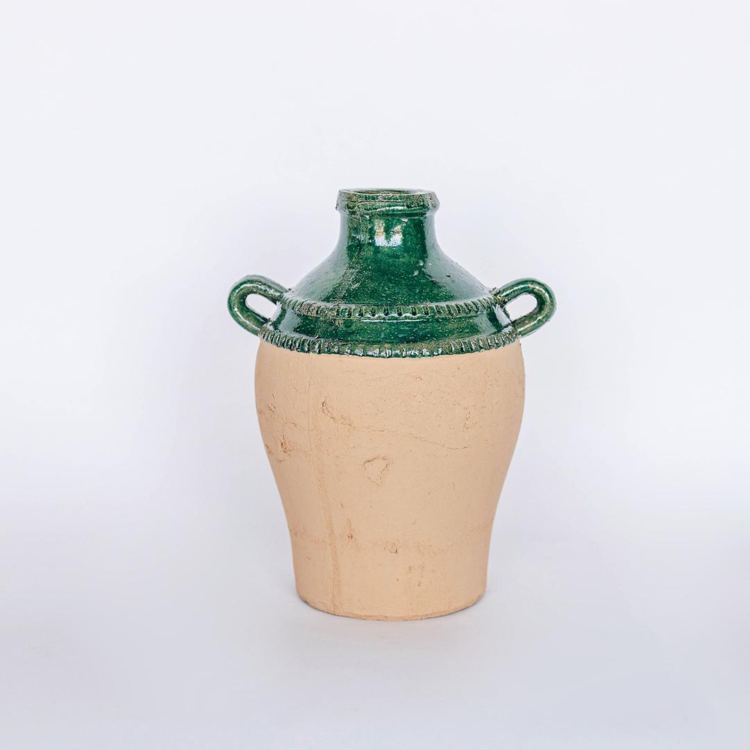 This charming terracotta vase features a tall shape, glazed green top, and convenient handles. Its earthy beige and green tones add a natural elegance to any space. Measuring approximately 10" high by 7" wide, it’s the perfect size to showcase faux blooms or stand alone as a stylish accent.