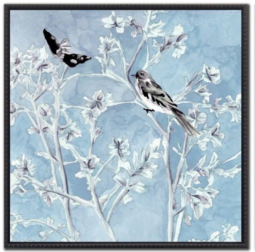 Elevate your space with the Vintage Black Floating Frame featuring "Tranquil Perch." This 24x24 artwork captures a serene bird perched among tree branches, accompanied by a delicate spotted moth. The cool, muted palette of tan, light blue, white, and dark brown adds a calming, sophisticated touch to any room. Perfect for those seeking a peaceful, nature-inspired accent, this piece invites quiet reflection and timeless elegance. Available for pick up only, it’s a unique addition that transforms your décor with subtle beauty.