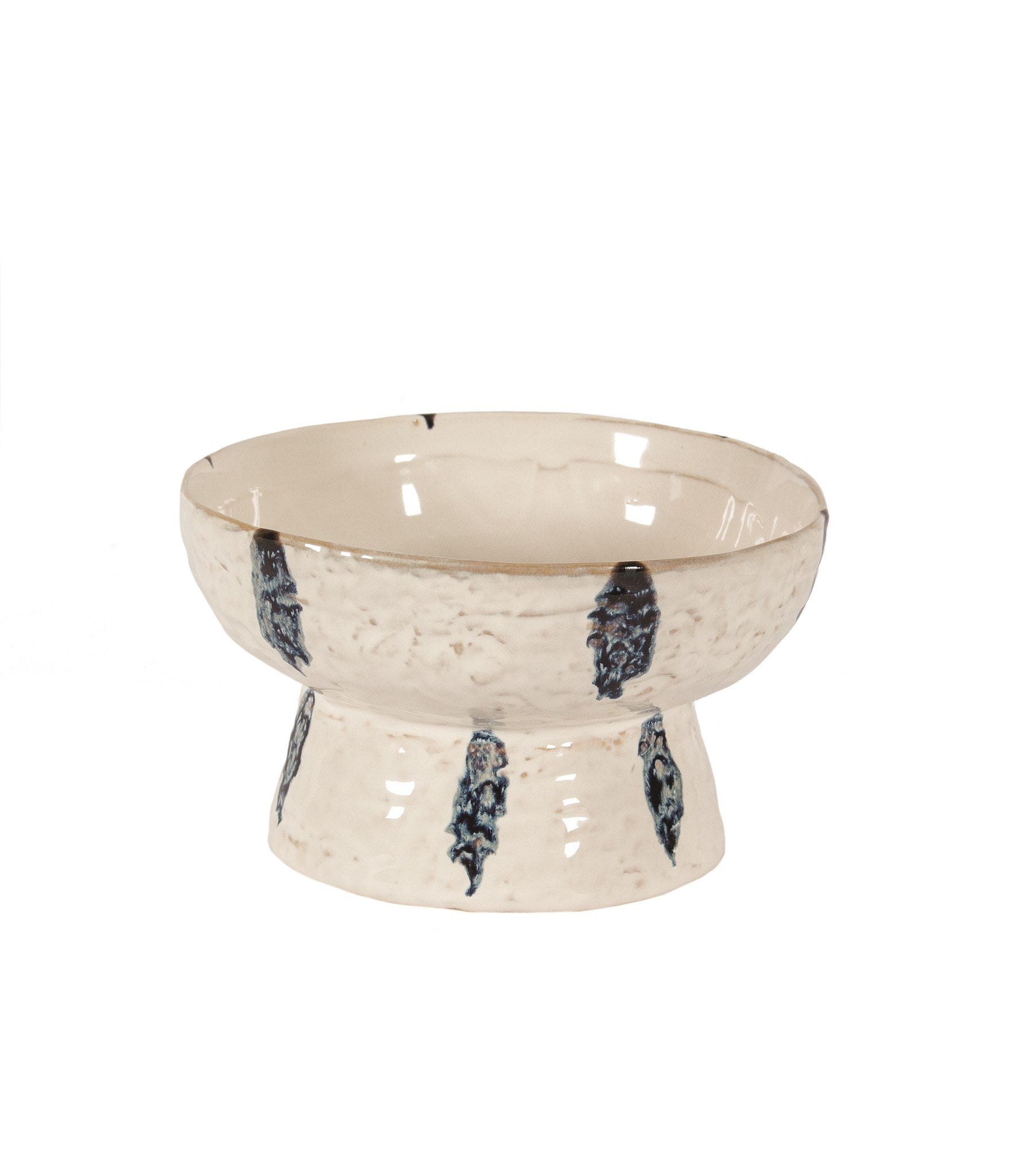This earthenware footed bowl is crafted with a small, white glazed finish featuring hand-painted vertical navy brushstrokes. Perfect for elevating any table setting, this bowl measures 6 inches in diameter and 3.5 inches in height. A unique and timelessly stylish piece, it makes an elegant and eye-catching addition to any interior.