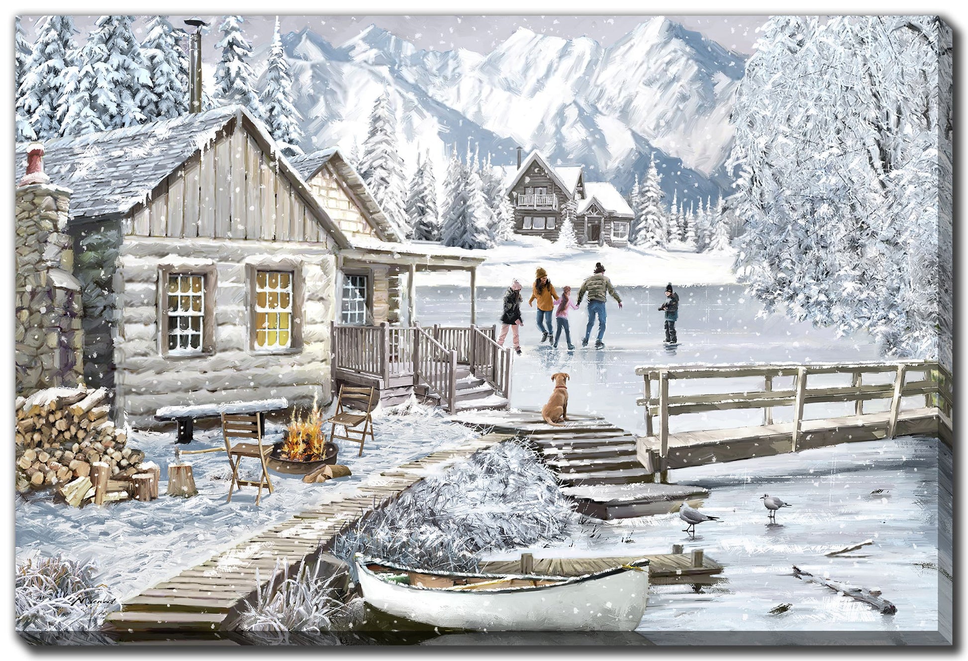 Bring the magic of winter indoors with this 24x36" Winter Cabin Print featuring people skating on a frozen pond. This canvas captures joyful moments amid a serene snowy landscape, adding warmth and festive spirit to your home. Available for store pickup only, it's a perfect way to celebrate the season and create a cozy atmosphere.